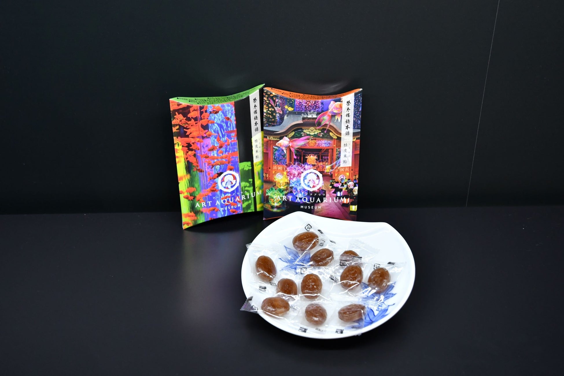 上品な甘さと素材の風味が豊かな羊羹です。ここでしか買えない当館オリジナルフレーバーもとても人気です。美しく舞う金魚をイメージしたパッケージでアートアクアリウムならではの