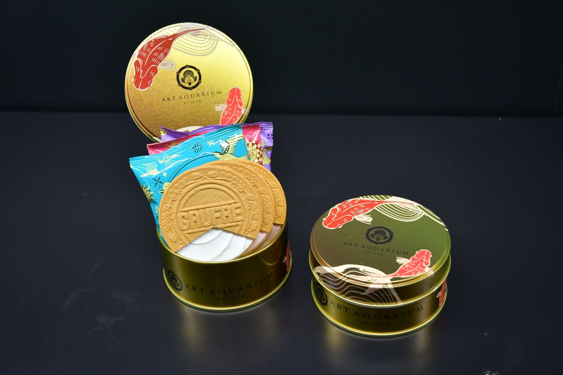 老若男女に愛される東京銘菓も、金地に赤色の金魚が泳ぐゴージャスなオリジナルデザイン缶で販売しています。