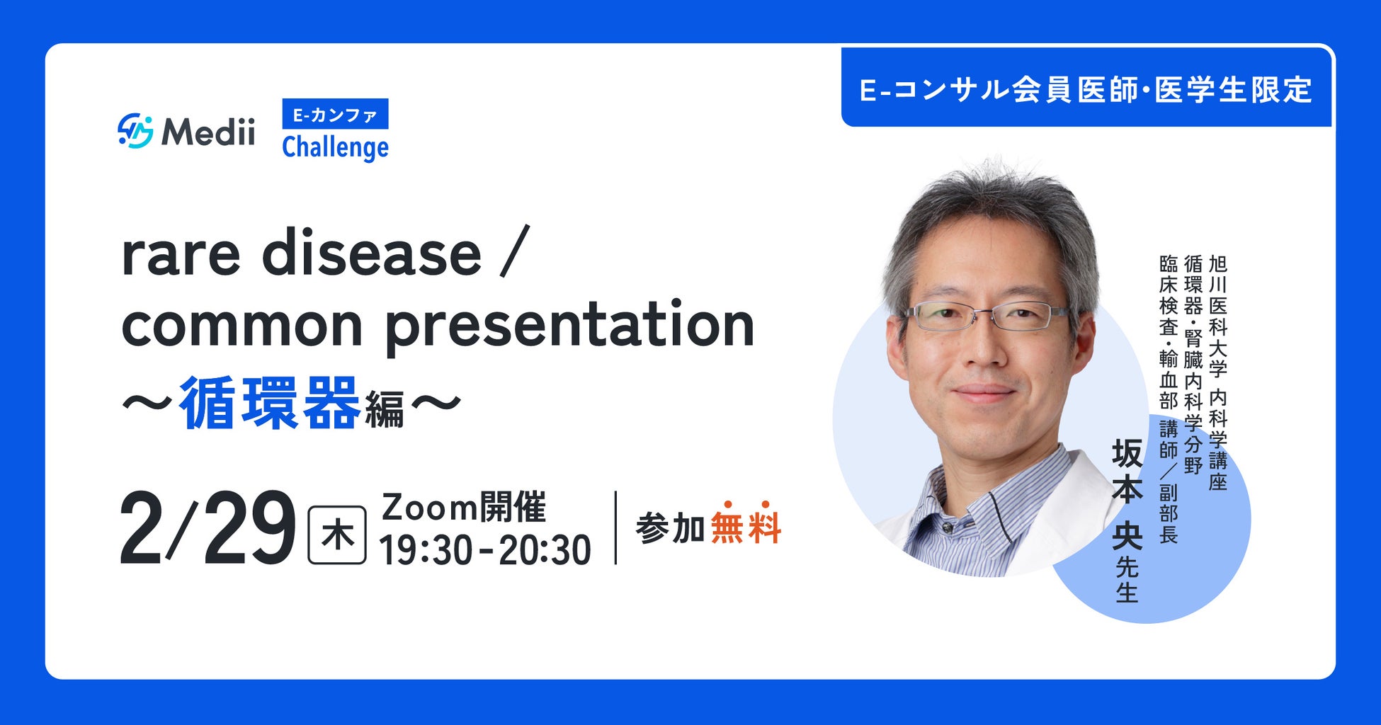 「rare disease /common presentation〜循環器編〜」では、循環器領域における希少疾患をテーマとして、循環器希少疾患のエキスパート専門医を講師にお招きし、一般的な症候から所見を見逃さず早期診断・治療介入を行うための思考を、症例カンファレンス形式で解説いただきます。