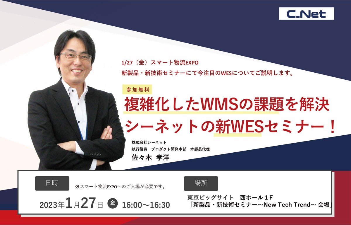 株式会社シーネット(本社:千葉県千葉市、代表取締役社長兼CEO:小野崎伸彦、以下シーネット)は、2023年1月27日(金)に『複雑化するWMSの課題を解決!~シーネットの新WES紹介セミナー』と題したセミナーを開催します。