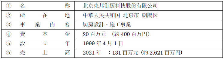 東邦御厨社は中国の北京市に拠点を置く業務用厨房設計・施工会社であり、高級ホテルや大手企業向け社員食堂内における厨房施工等を強みとし、市場からも高い評価を得ている会社です。東邦御厨社は近年、既存顧客に加え、チェーン店レストラン、スーパーマーケットやコンビニエンスストアへの事業を拡大しており、さらなる収益力向上が期待できます。