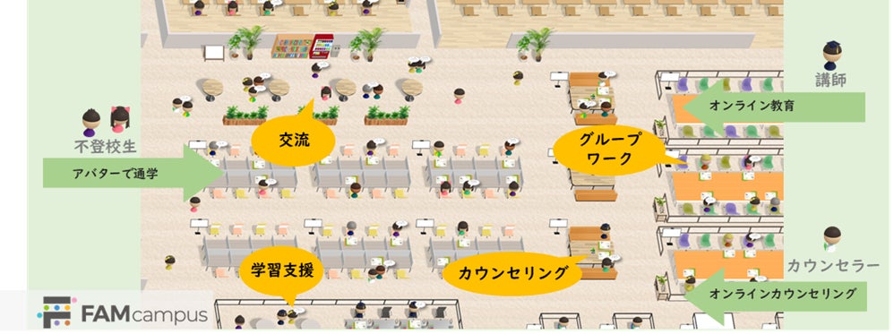 この実証事業では、不登校生を支援する支援プログラムと体制を構築し、「FAMcampus」上での実証を通じて、不登校対策におけるバーチャル教育空間(教育メタバース)の効果を検証するとともに、検証結果に基づく課題の抽出と教育機会の保障につながる新たな可能性を検討いたします。