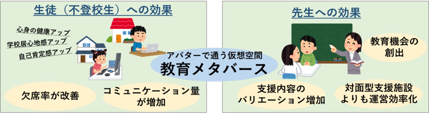 内 容:不登校生がアバターでバーチャル教育空間に通学し、不登校支援プログラムへの参加、講師やカウンセラーによる支援を受ける。