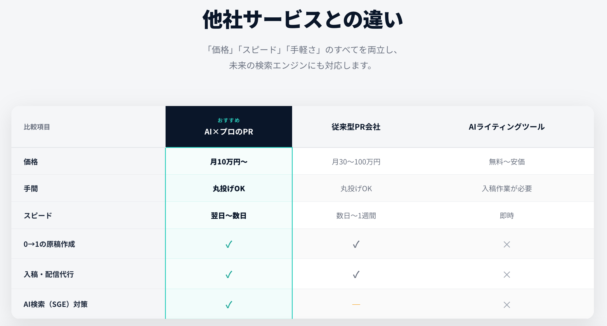 従来の広報代行会社では月額30万円以上が相場でしたが、本サービスはAIを積極的に活用した業務効率化により、月額10万円(税抜)からの提供を実現しました。コストを抑えながらも、原稿のクオリティや配信頻度において従来サービスと同等以上のアウトプットを提供します。
