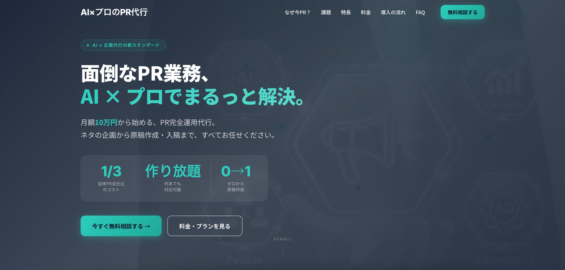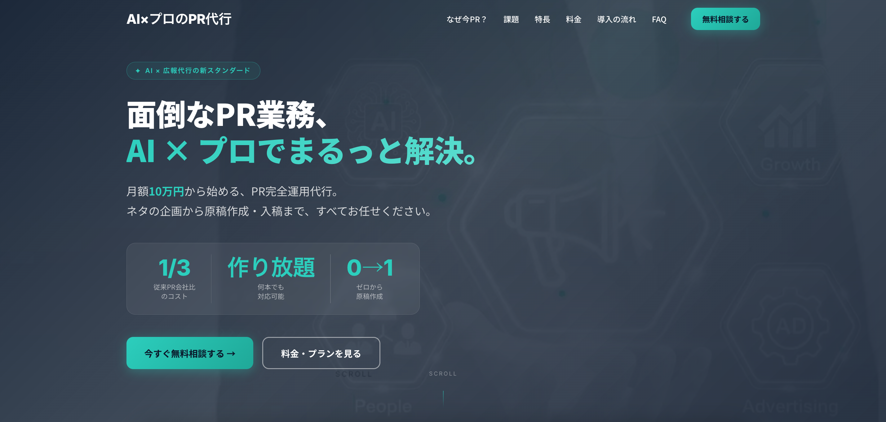 「書く時間がない」「何を発信すべきかわからない」「ネタが尽きた」中小・スタートアップ企業が抱えるPRの3大課題を解決。AI検索時代に不可欠な情報資産化を、月額10万円から実現します。