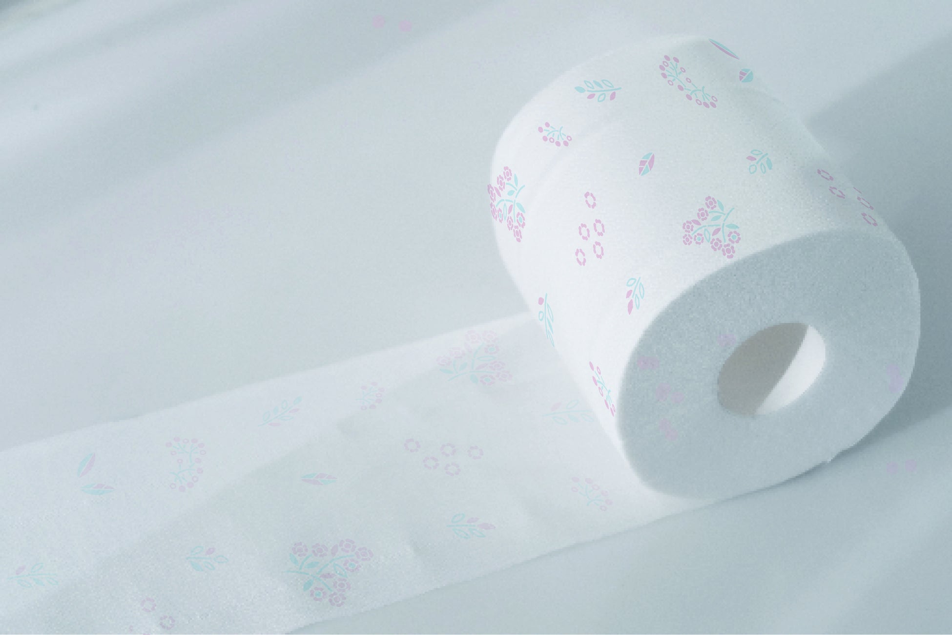 花びら、つぼみ、葉っぱなど、花を取り巻く植物を淡いピンクとブルーでデザインしたプリントロールがトイレを華やかに演出する商品です。
