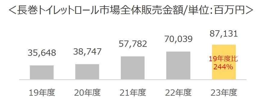 2023年度、トイレットロール市場における長巻カテゴリーは、2019年度比で244%に拡大しています。