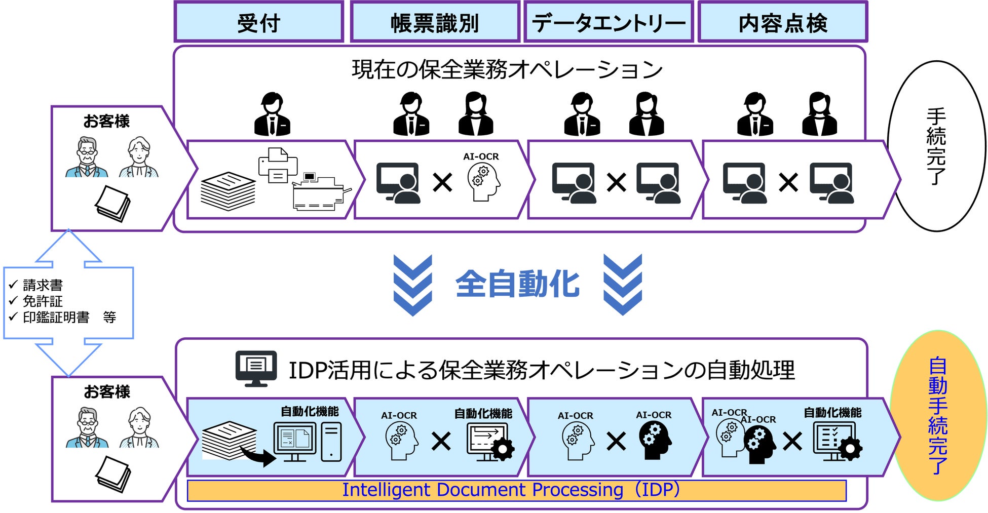 *1 Intelligent Document Processing(IDP):保険契約者様より紙や画像にて受領する様々な文書を自動処理するための技術。人工知能(AI)や高度な画像処理技術を用いて文書からのデータ抽出や処理を自動化するオペレーション変革の仕組み。