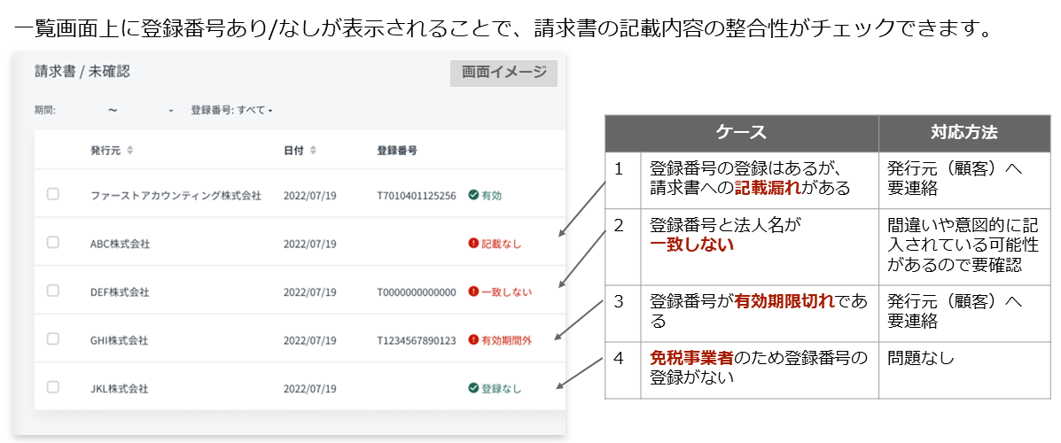 このソリューションでは、ファーストアカウンティングの特許技術により、適格請求書発行事業者登録番号の妥当性を自動確認できることが最大の特徴です。