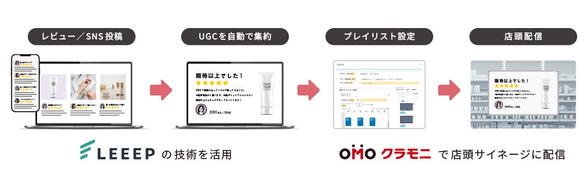 「UGCクラモニ」は、ECサイトやSNSでのユーザー投稿、スタッフ投稿を自動的に集約し、「クラモニ」で配信スケジュールなどを設定して、店頭に設置されたサイネージに配信する仕組みです。配信コンテンツには、レビューや画像に加え、動画も含めることが可能です。また、レビュー画面は商品や企業ごとにカスタマイズできるよう設計を進めています。この自動集約機能には、レガリの「LEEEP」の技術を活用し、ビーツとレガリが共同で、新たな購買促進機能の実現に向けて開発を行っています。
