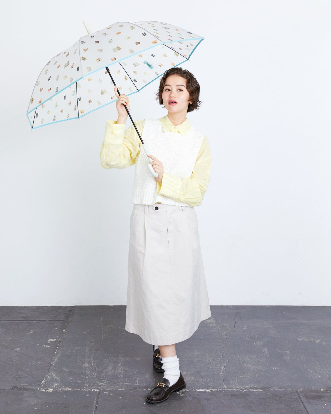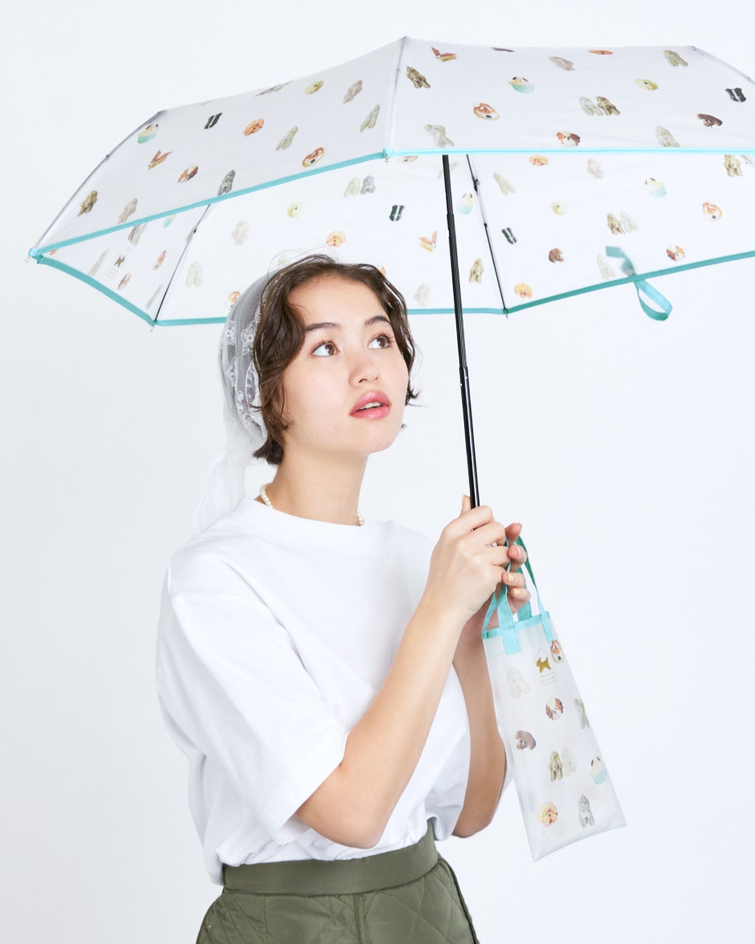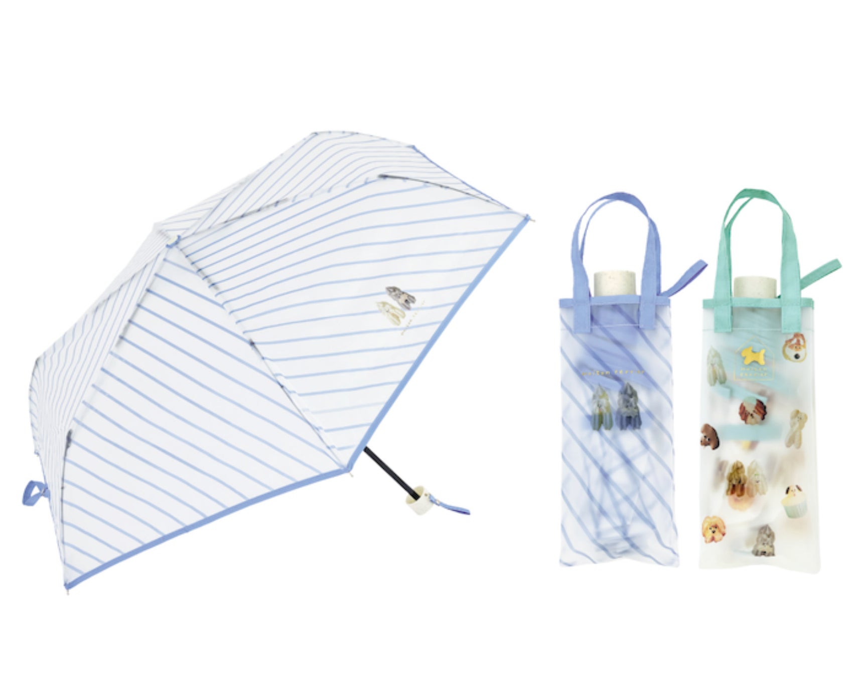 半透明のビニール素材に、たくさんのお菓子が可愛く並んだモチーフ柄と、メレンゲクッキー犬2匹が仲良く並んでいるストライプ柄の2種が登場!雨の日が待ち遠しい、優しい雰囲気のビニール傘に仕上がりました。