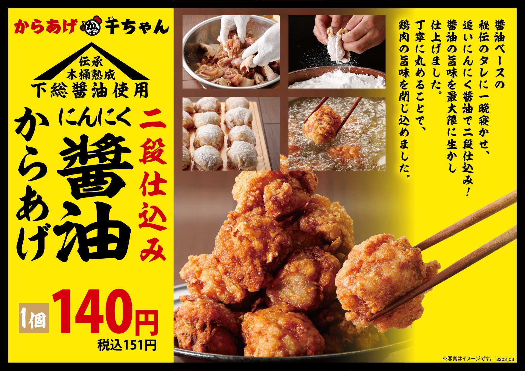 醤油ベースの秘伝のタレに漬け込み、追いにんにく醤油でさらに漬け込み、醤油の旨味を最大限に生かした二段仕込みです。