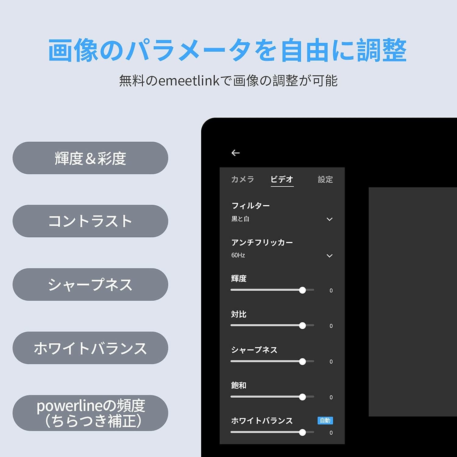 eMeet社の提供する無料ソフトウェア『eMeet Link』をデバイス側にインストールすることで、各種パラメータの調節やアップグレードなどを行うことが出来ます。