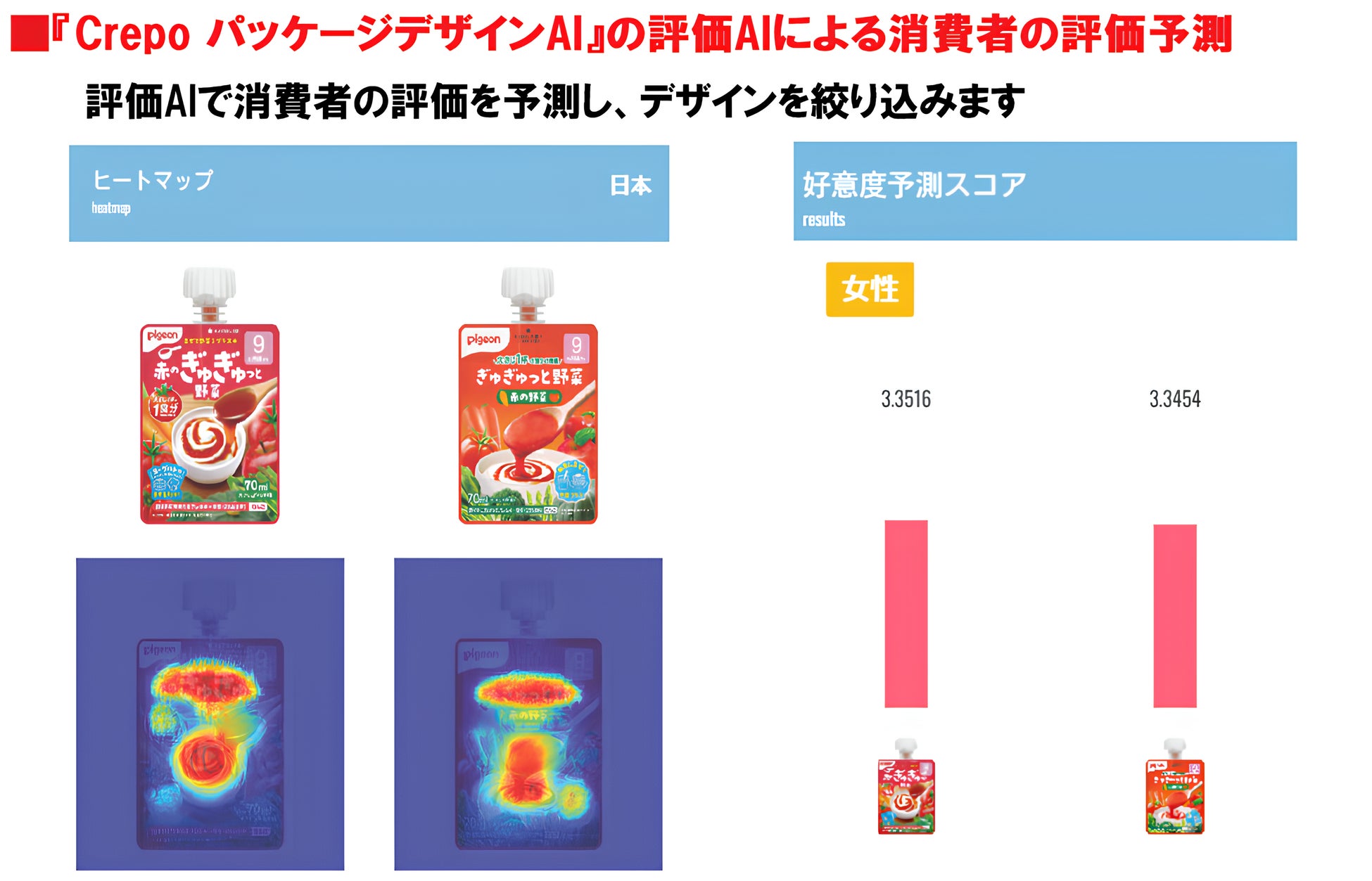 『ぎゅぎゅっと野菜』のデザイン開発では、『Crepo パッケージデザインAI』の生成AIと評価AIを活用しました。評価AIは1,300万人分の消費者調査の結果を学習させたAIが消費者の商品デザインへの評価を瞬時に予測します。訴求したい部分がしっかりと視認されているかを確認し、デザインを絞り込みました。