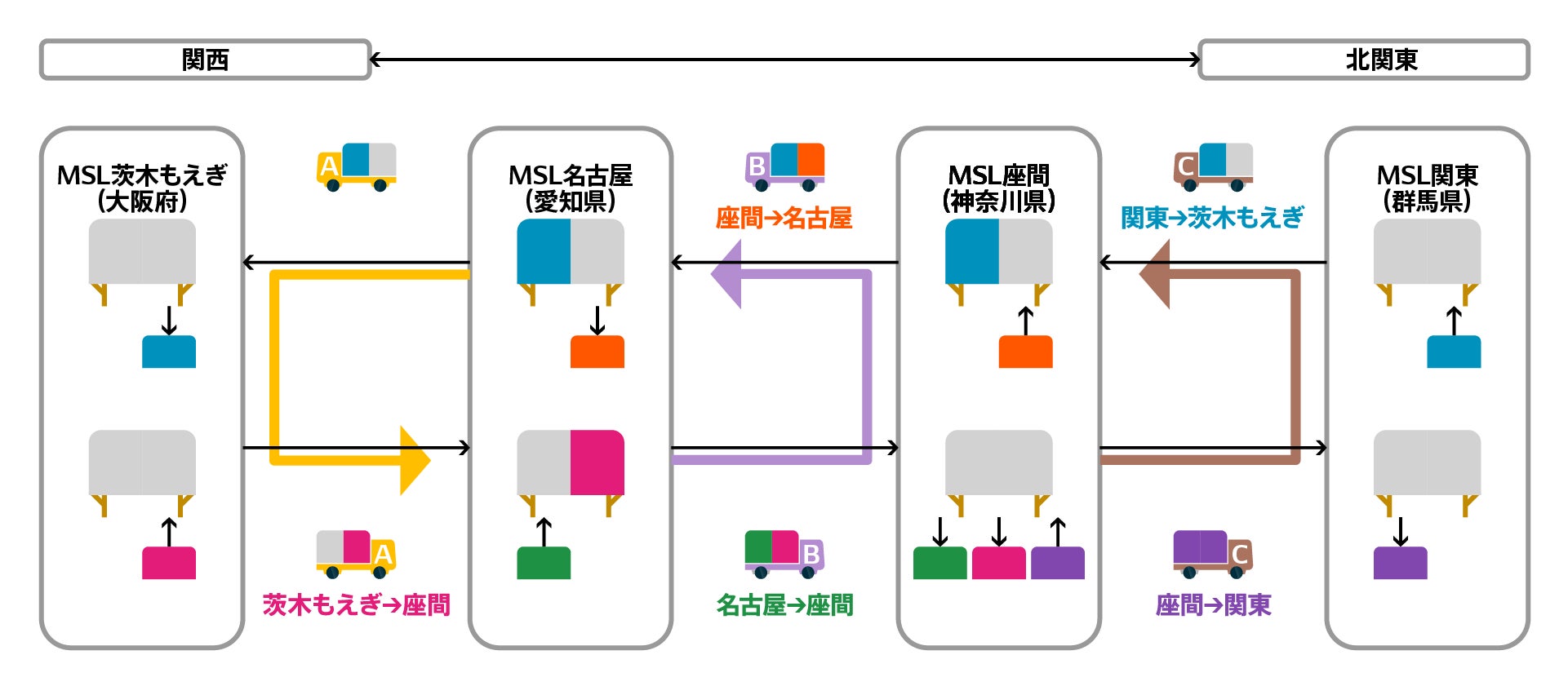 MSLが運営する、2カ所の中継地点(MSL座間事業所「神奈川県座間市」・MSL名古屋事業所「愛知県春日井市」)で貨物の混載を行い、北関東から関西、関西から北関東に輸送します。