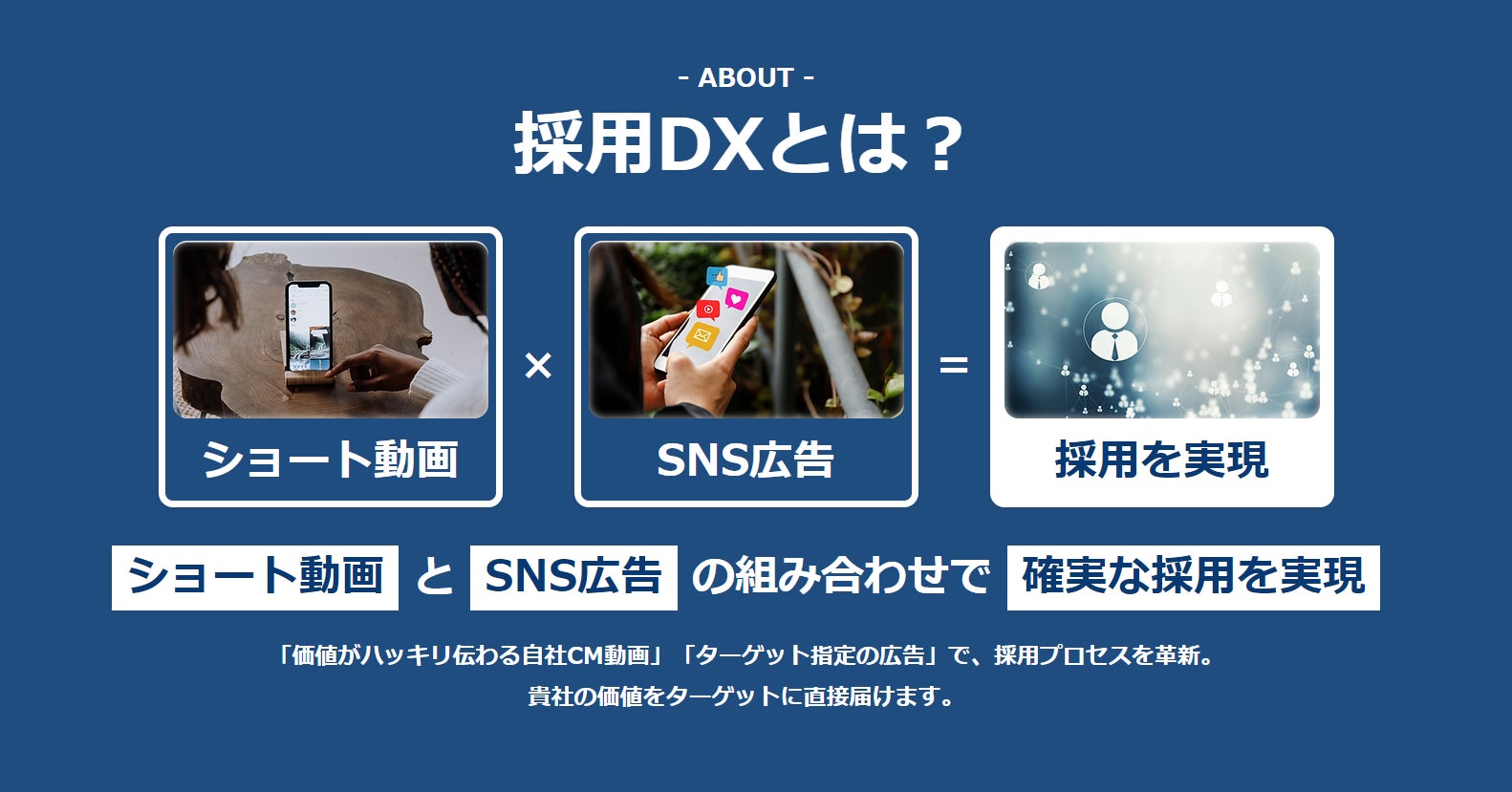 採用DXは、ショート動画とSNS広告を組み合わせた革新的な採用サービスです。企業の魅力を最大限に訴求する動画制作と、ターゲット特定の効果的なSNS広告戦略を通じて、企業の採用効率を大幅に向上させます。