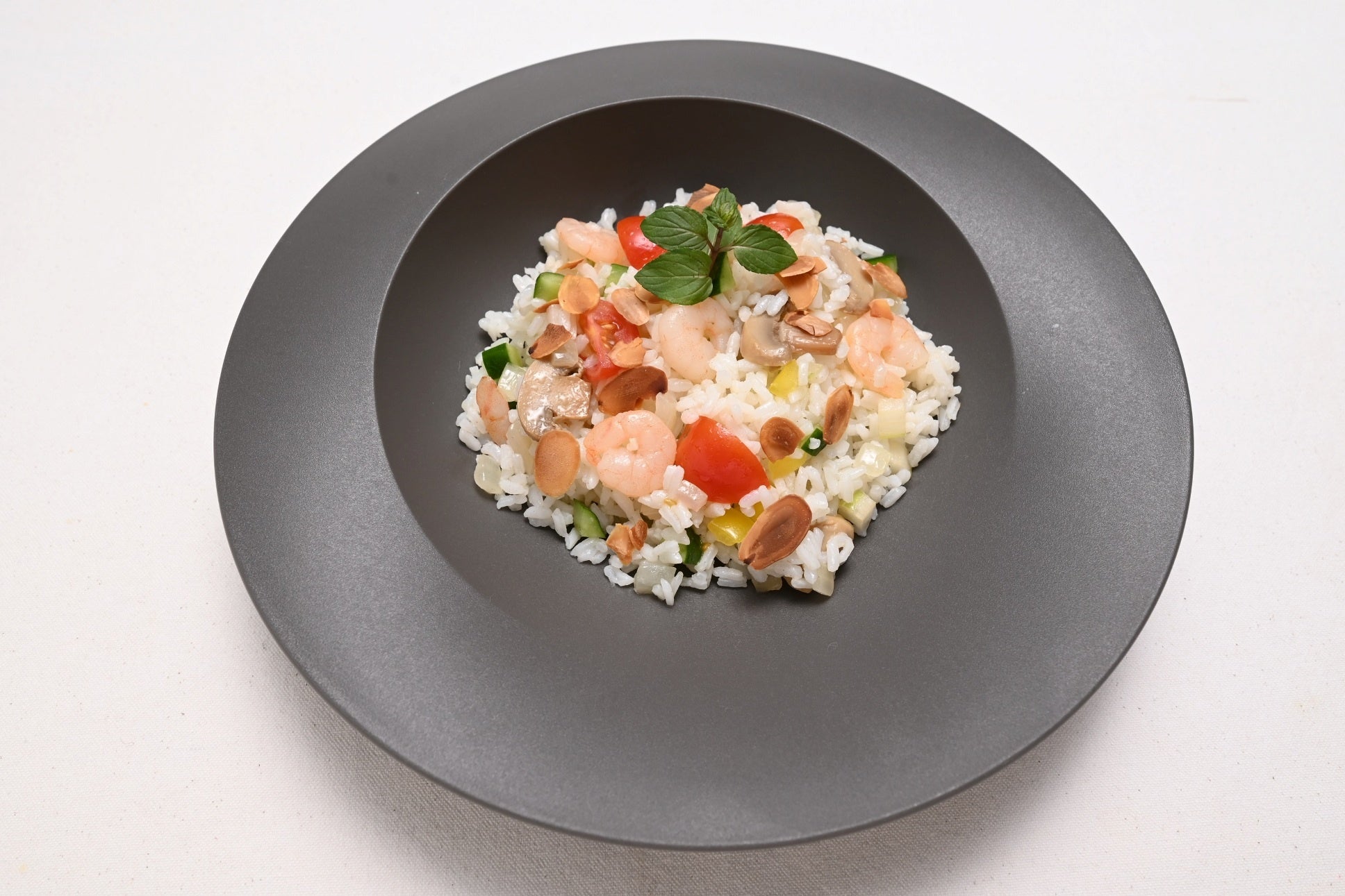 エビや彩り野菜、アーモンドの食感が楽しいライスサラダ。冷やしても美味しい「カルローズ」は、サラダスタイルにもぴったりで、軽く、さらりと食べられる新感覚のボウルメニューです