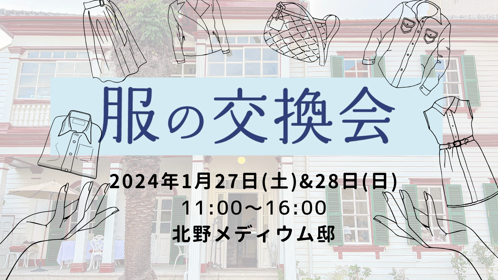 今回の『服の交換会』は、ワンピース、服の交換会の活動に賛同し『服の交換会』自主開催を行う団体ぐるりんご、北野メディウム邸の3者が共創する、神戸北野に位置する異国情緒溢れる異人館を舞台に、古をつなぐ、お手入れをして長く使うということに思いをはせる、いつもとは少し異なる服の交換会を実施いたします。