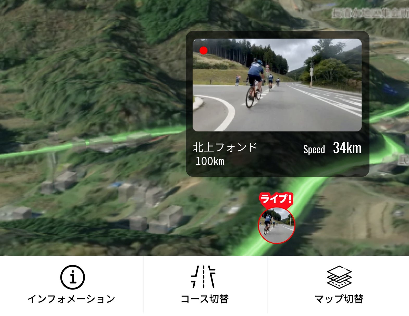 ・応援したいライダーを検索することで、そのライダーが「今どこにいるか、どこをどのように走ってきたのか」を見ながら、遠隔で応援することが可能です。また、Mapbox社のライダー車載カメラで撮影されたライブ映像により、 スタートやゴールのダイナミックな瞬間や見晴らしのいいコースを見ることができるため、スピード感や風景の素晴らしさを応援しながら追体験できます。