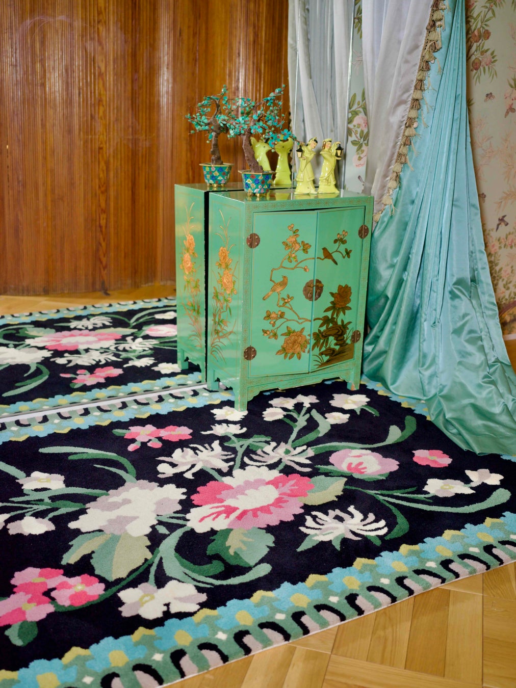 日本でも数少ないハンドメイドラグファクトリーとして知られる「三好敷物」が製作したラグです。三好敷物は、タフティングガンと呼ばれる手持ちミシンを使用し、1点ずつ丁寧に手作業でラグマットを製作しているため大変貴重なアイテムです。KEITAMARUYAMAとのコラボレーションでは、招き猫やドラゴンなどの人気モチーフに続き、今回が第2弾となり、クラシックなフラワーモチーフを用いた大判ラグが登場します。