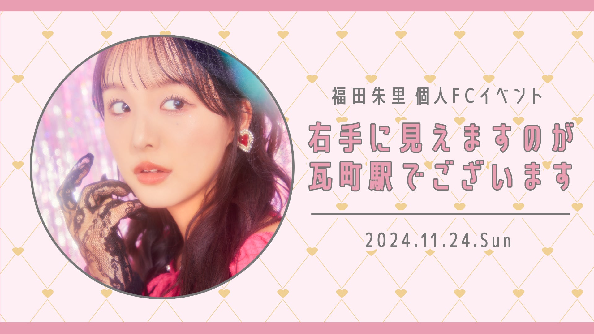 2024年11月24日(日)、福田朱里個人ファンクラブ会員限定イベント「右手に見えますのが瓦町駅でございます」が開催されることが決定しました。前回の2024年2月に開催された「フクフェスVol.2 アフターパーティー」に続く第3回目のソロイベントとなり、ファンの皆さまと一緒に楽しめる特別なパフォーマンスや企画を多数ご用意しております。