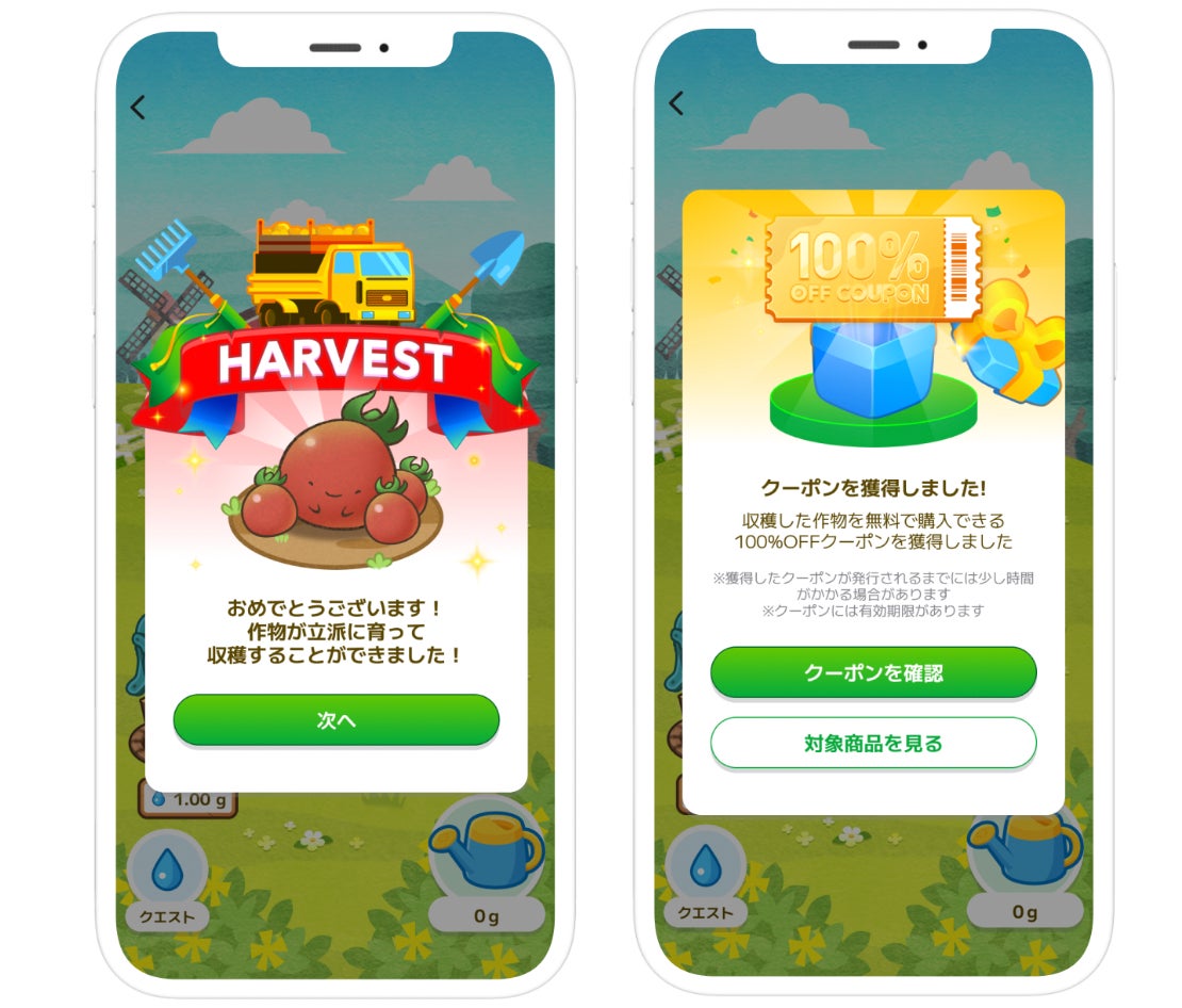 ※ アプリ内にある農園で育てた作物を収穫すると、デジタルの作物に対応する「カウシェ」上の商品の代金が全額割引となるクーポンが交付されます。このクーポンを利用して商品を購入いただく必要があります。