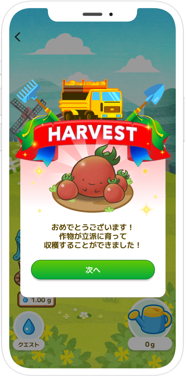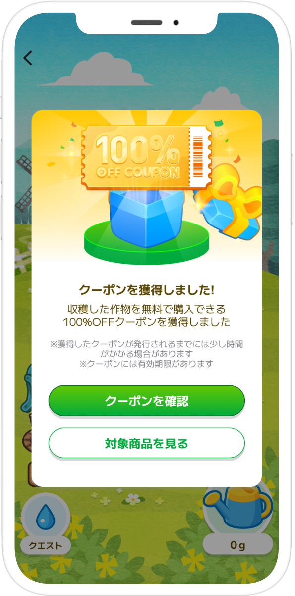 デジタルの作物を収穫すると、本物の作物と交換できる100%OFFクーポンが発行され、商品が自宅に届く