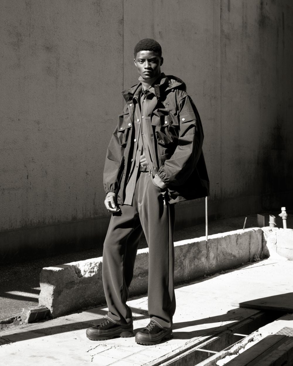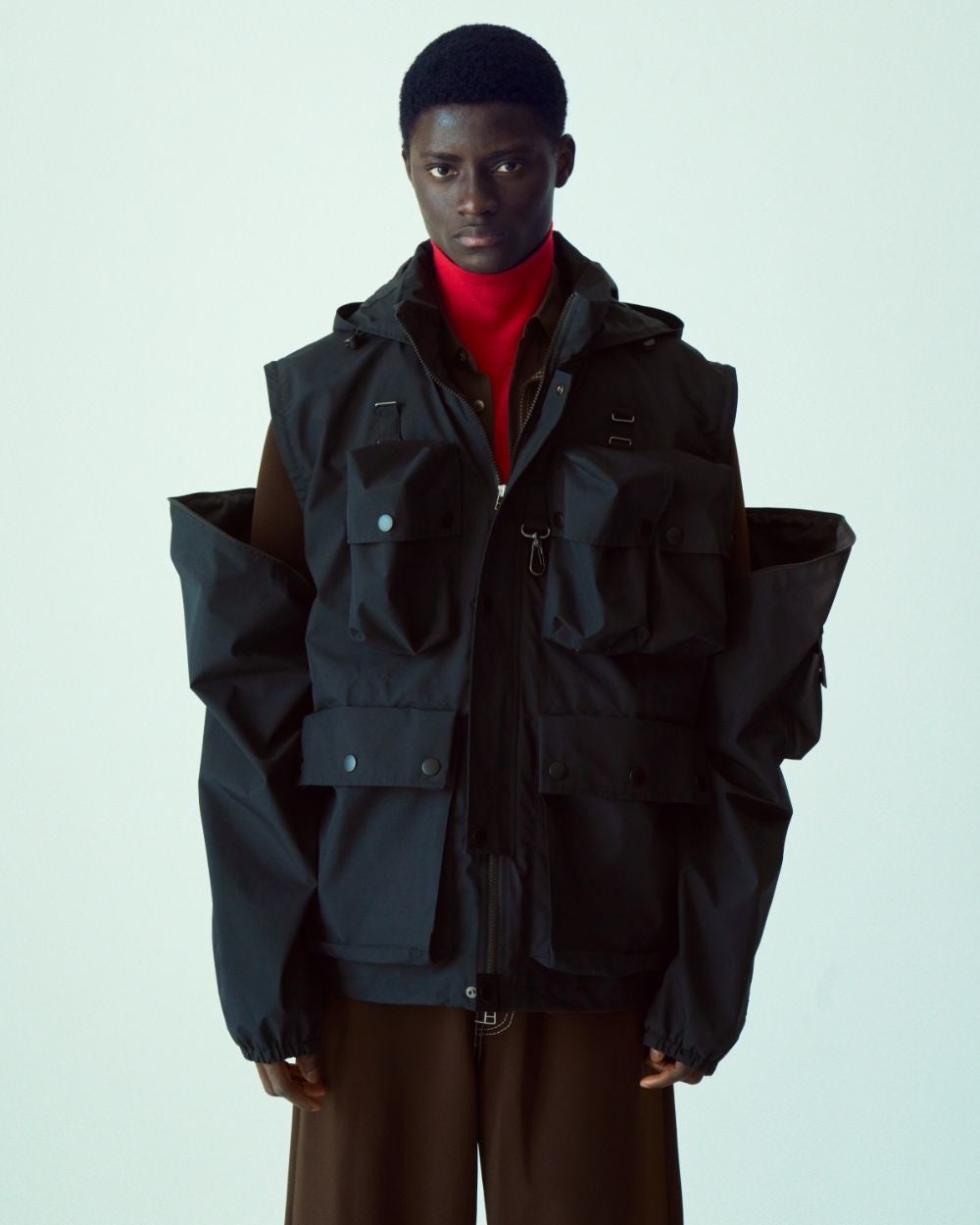 M-60の最も特徴的なマルチポケットを現代向けに厳選して簡素化し、袖はファスナーで着脱可能でベストとしても着用出来る様に変更しました。フードも衿収納にし、裾にはドローコードを追加して絞れるようにしています。背中にも大型のポケットがあるためバッグいらず。裏地はナイロンで、ファスナーには止水ファスナーを使用。袖口には本体と同色でWINDSTOPPER® BY GORE-TEX LABSの刺繍、反対にYOKEと+phenixの刺繍を施しています。