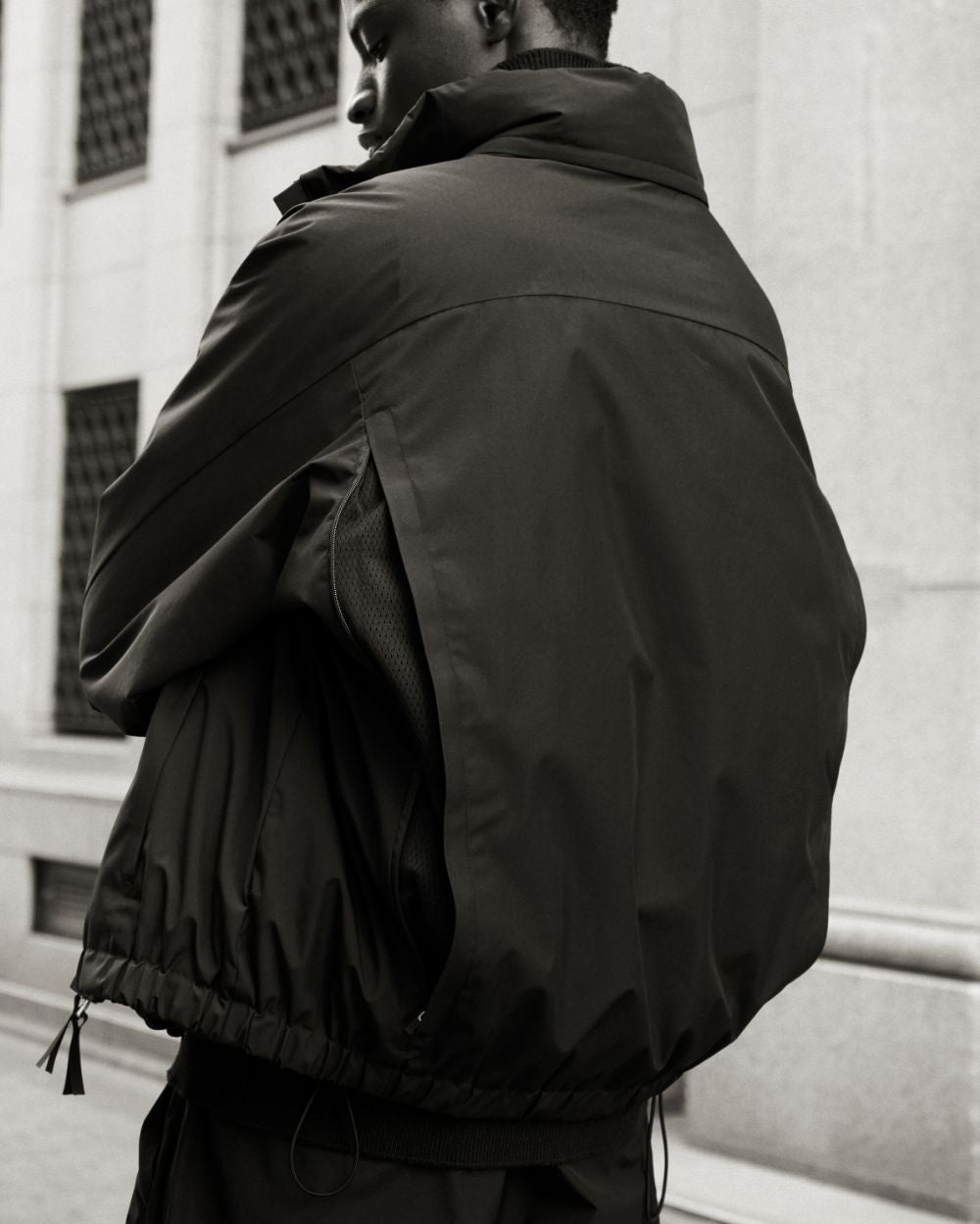 雨の時は衿収納にしたフードを出して使用可能。裾にはゴムで、ドローコードを追加してより強く絞れるようにしています。後ろ身頃には両サイドにファスナーで、開閉するベンチレーションで通気をよく出来ます。
