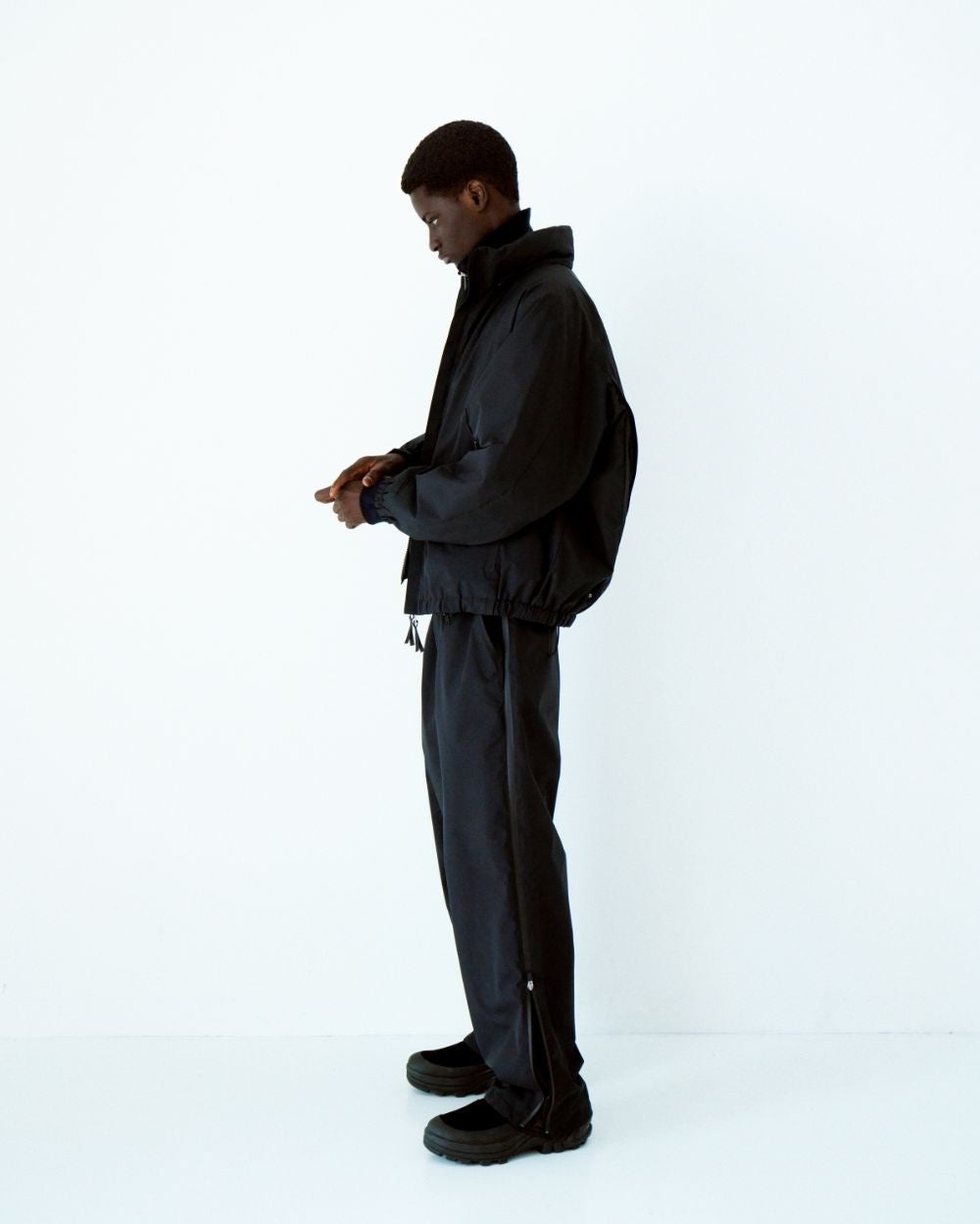 90sのトレーニングジャケットをベースに、出来る限りミニマルに印象になるように腰ポケットや袖口のファスナーは全て隠し、クリーンな印象にしたトレーニングジャケット。