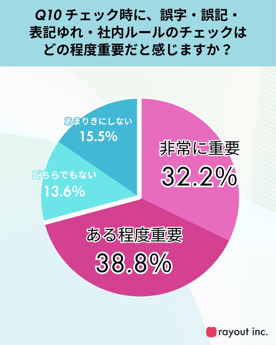 また、チェックバックにおける誤記・表記ゆれ・社内ルールへの準拠について、「非常に重要」「ある程度重要」と回答した人は合わせて7割(Q10)を占めており、細部の整合性が重視されていることがわかります。