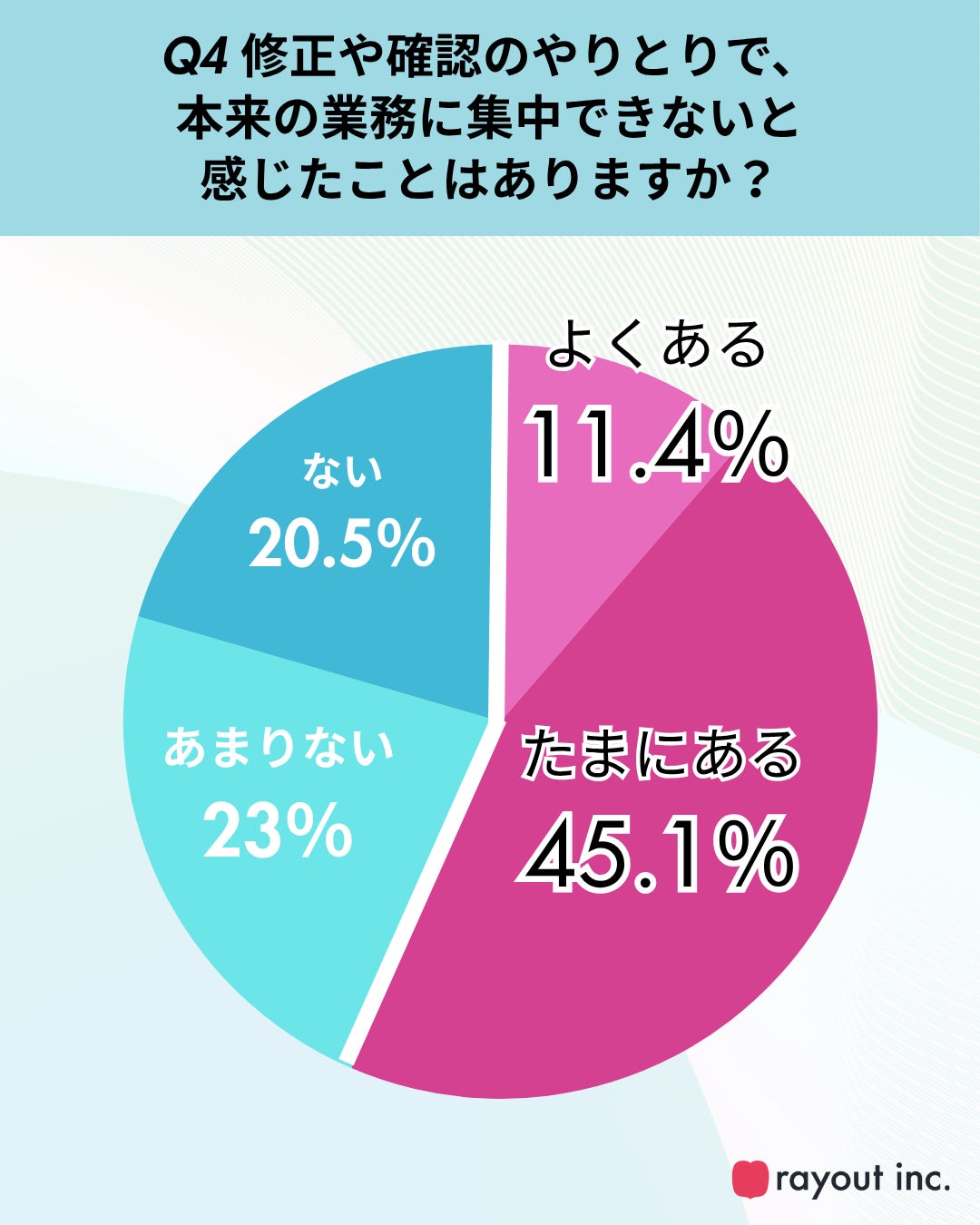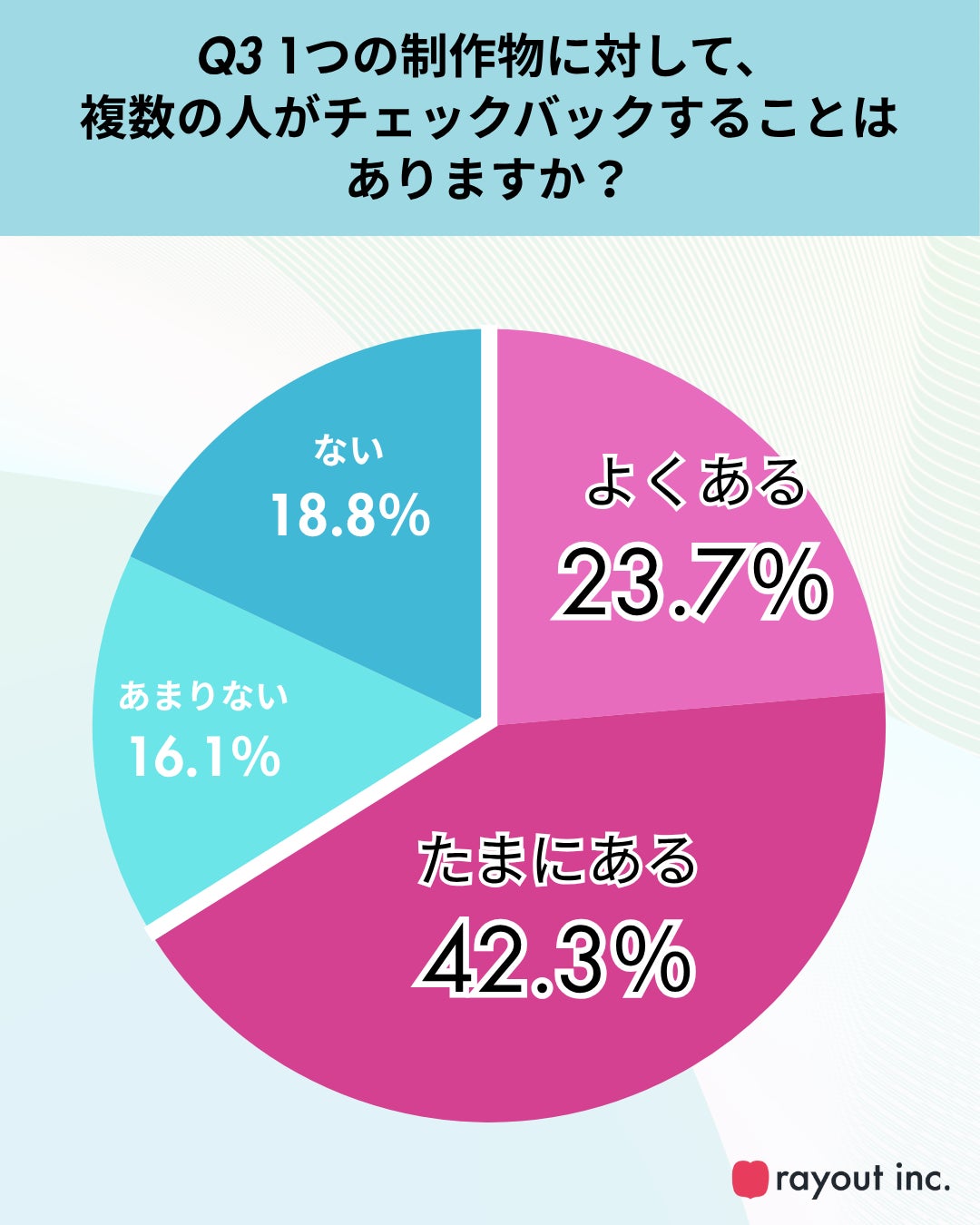 また、ひとつの制作物に対し複数人がチェックバックを行う状況が「よくある」「たまにある」と回答した人は7割を超えており(Q3)、多層的な確認フローが存在する実態も明らかになりました。