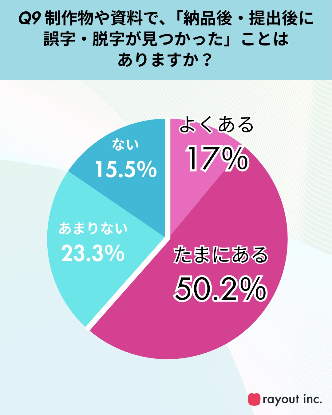 制作物や資料の提出後に誤字・脱字が見つかる経験について、「よくある」「たまにある」と回答した人は全体の6割にのぼり(Q9)、納品後の品質リスクが日常的に発生している実態が浮き彫りとなりました。