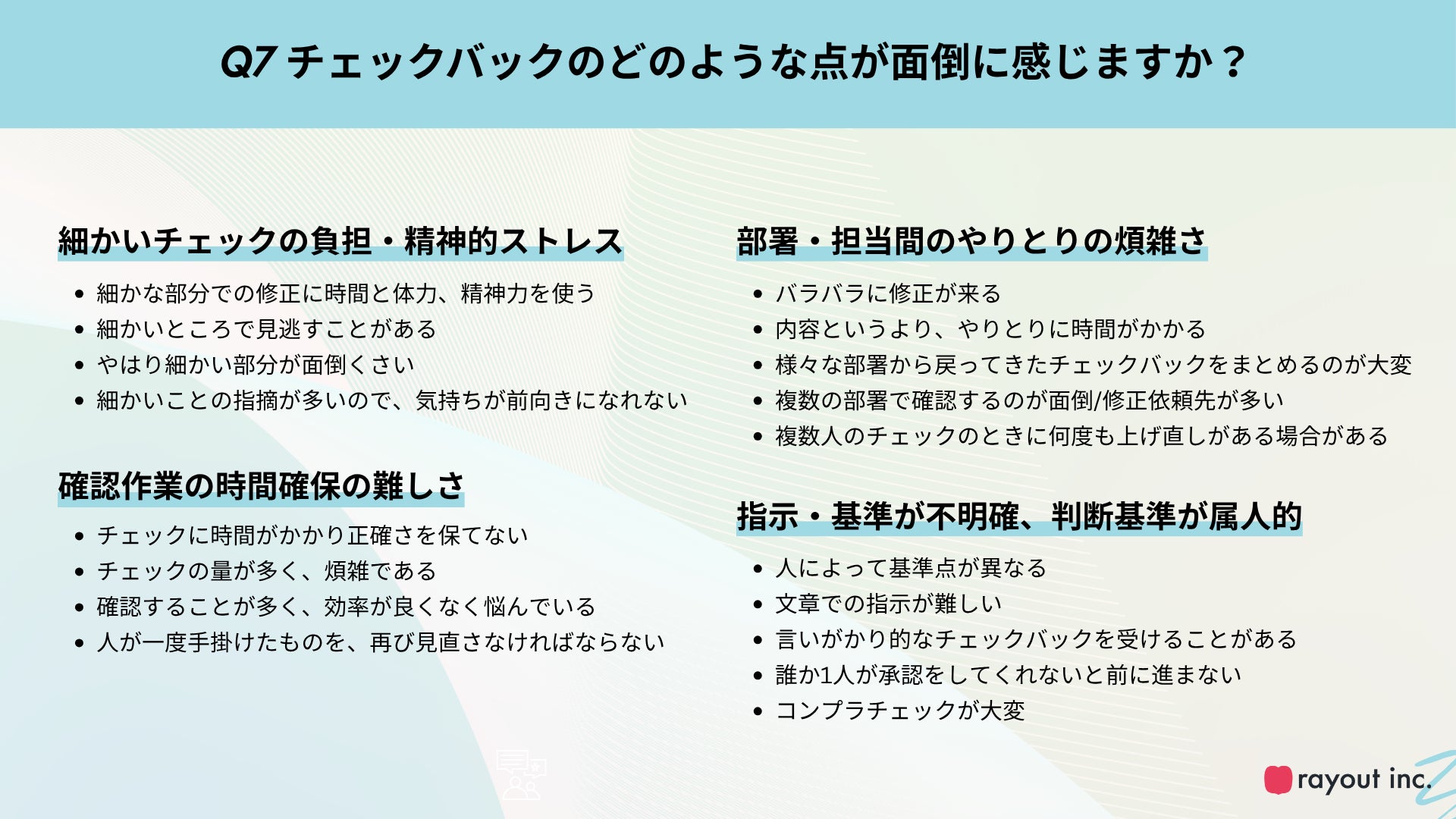 さらに、「チェックバックで面倒に感じる点」(Q7)に関する自由回答を分析したところ、以下のような課題が浮き彫りとなりました。