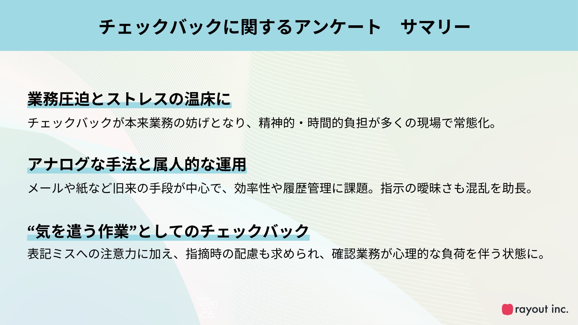 これらの結果から、チェックバック業務は単なる確認作業ではなく、業務効率やチーム間のコミュニケーションに大きな影響を与える領域であることが改めて浮き彫りとなりました。