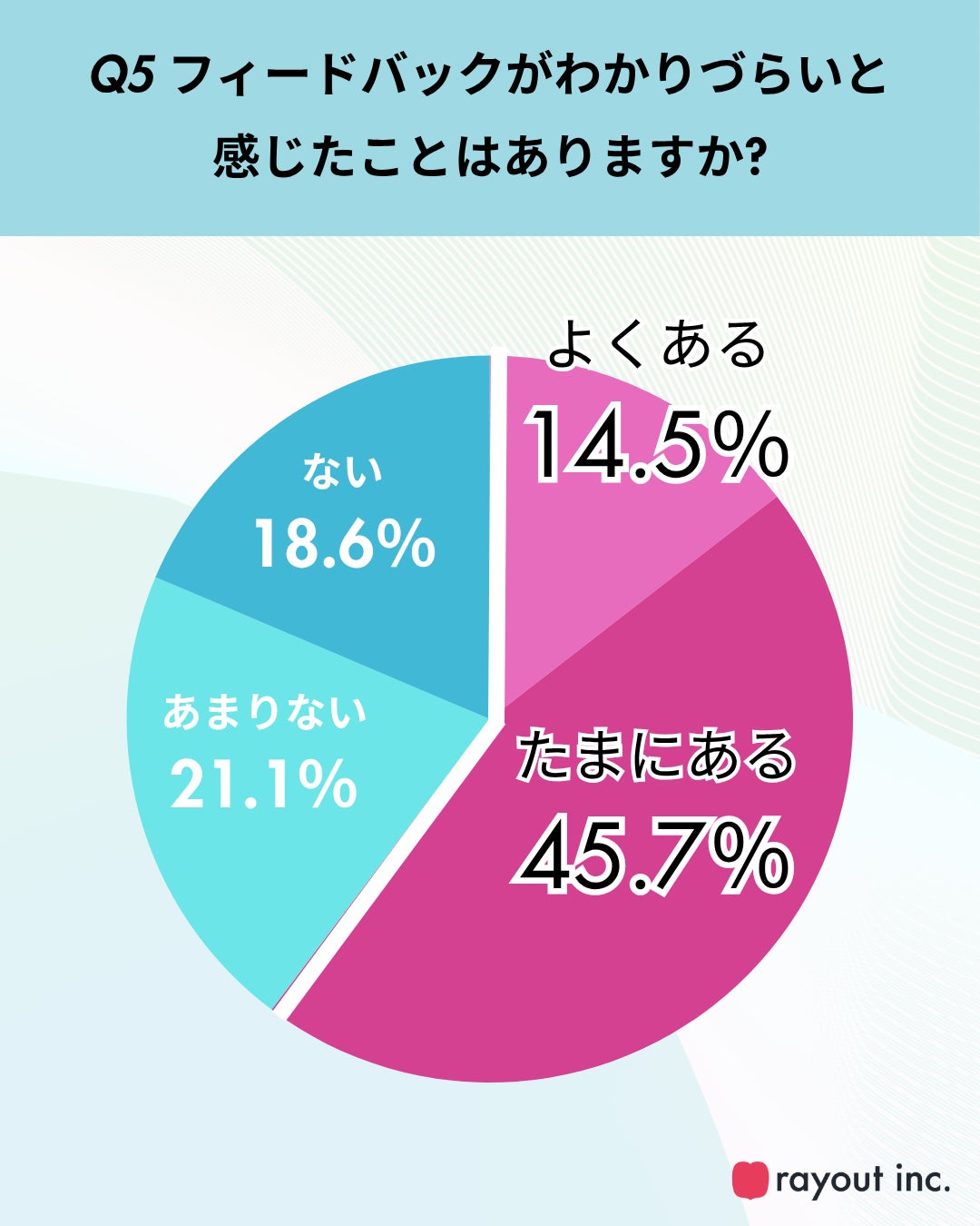 さらに、フィードバックがわかりづらいと感じたことが「よくある」「たまにある」との回答も6割に達しており(Q5)、指示の曖昧さや認識のずれがストレス要因の一つとなっていることがうかがえます。