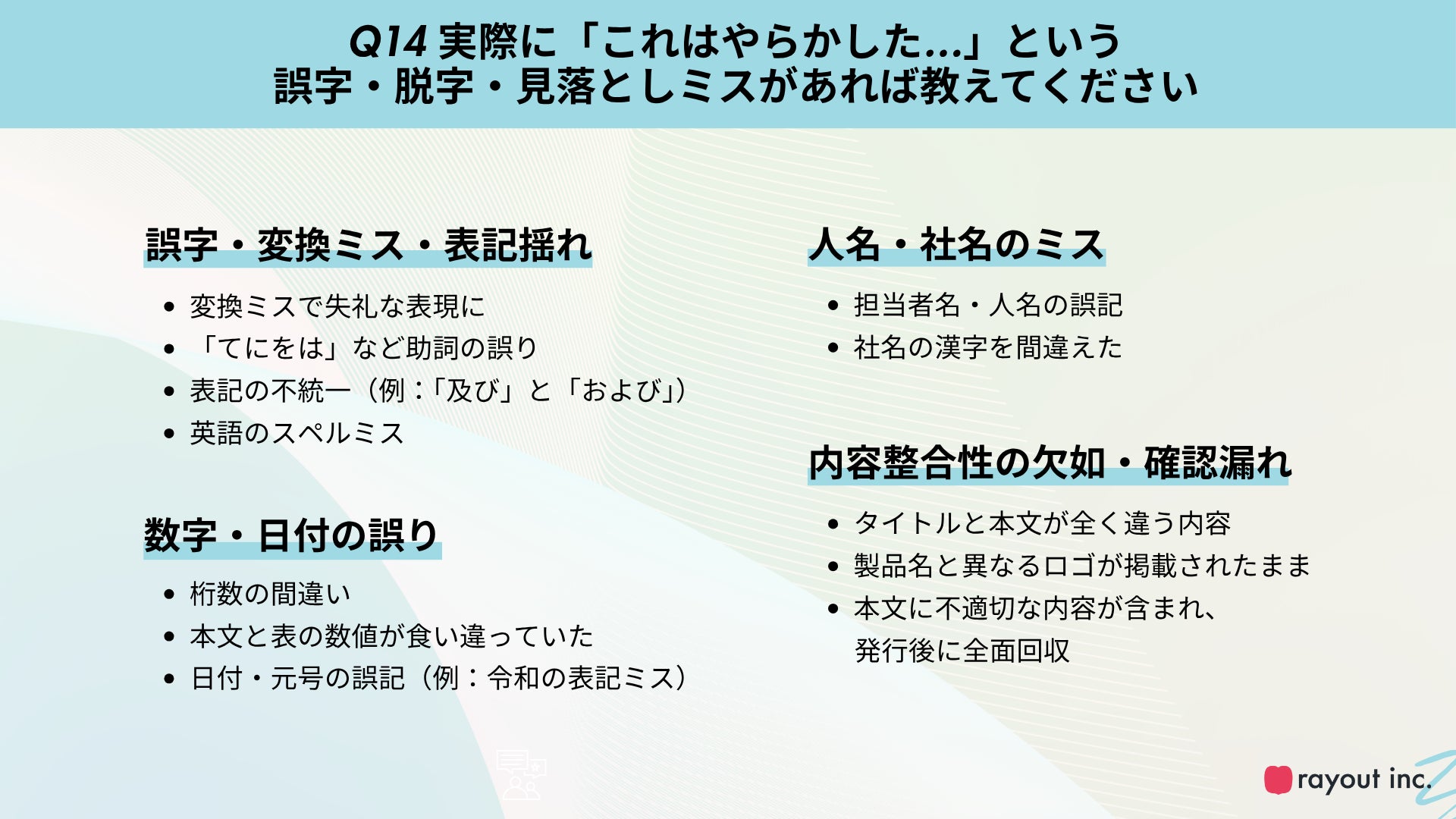 誤字や表記ゆれといった細かなミスへの注意、指摘時の配慮など、“気を遣う作業”としての側面も強く、業務負荷を高める要因となっていることが浮き彫りとなりました。