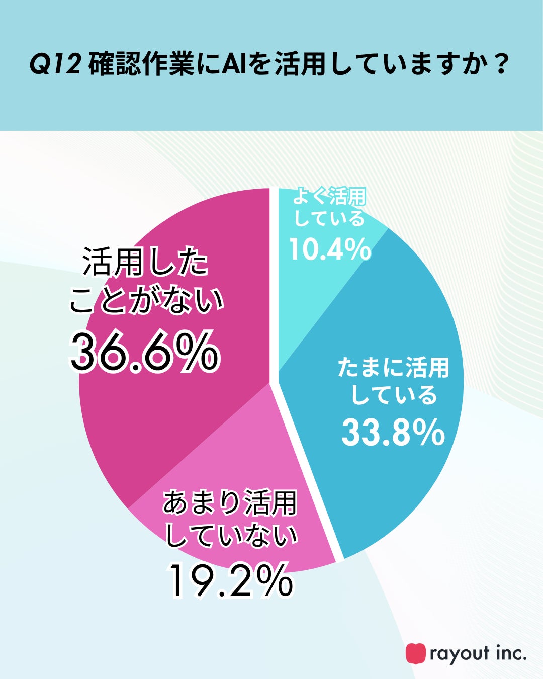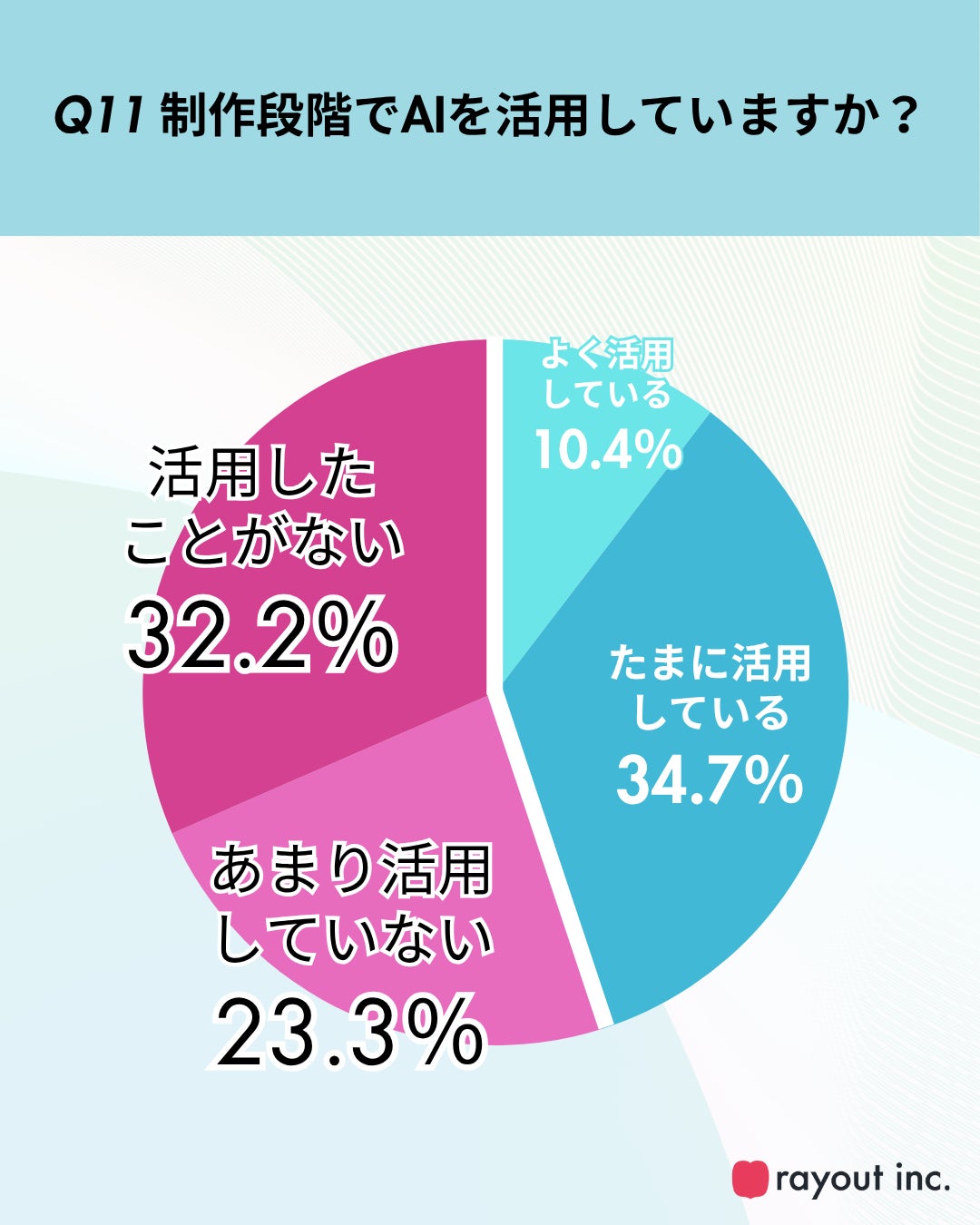 AIの活用状況を調べたところ、制作段階においても確認作業においても、「活用したことがない」「あまり活用していない」が半数以上となる結果となりました(Q11,Q12)。AIが身近な存在となっている一方で、制作現場や確認業務における活用はまだ限定的であり、今後の導入余地が大きいことがうかがえます。