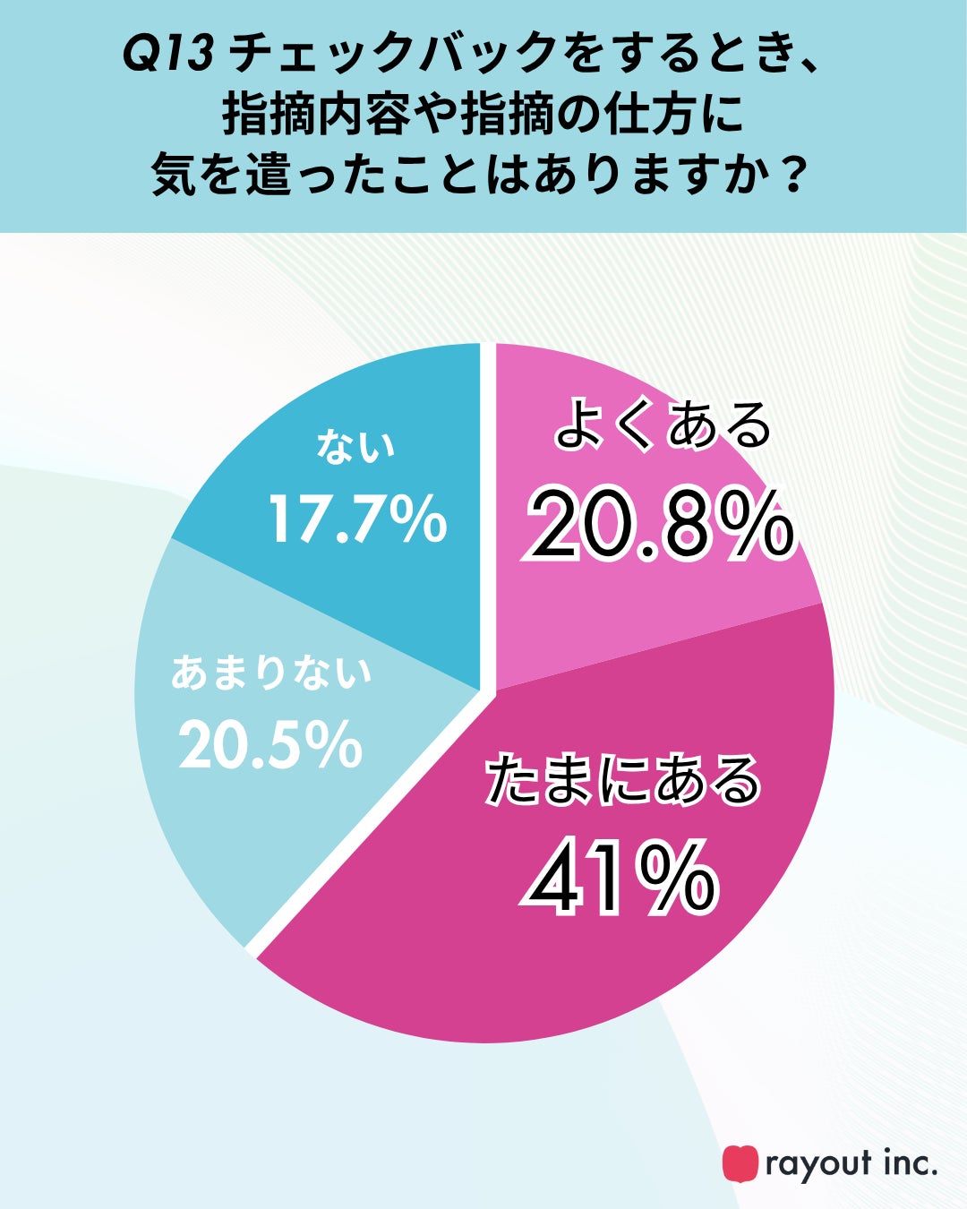 さらに、指摘内容やその伝え方に気を遣ったことが「よくある」「たまにある」と回答した人も6割(Q13)を超え、チェックバックが対人配慮を伴う“気疲れ”の原因となっている現状も明らかになりました。