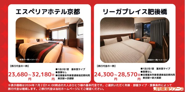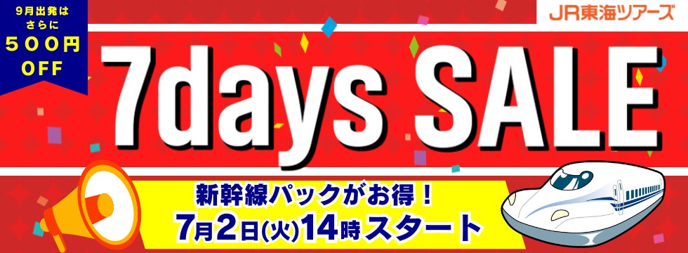 株式会社ジェイアール東海ツアーズ(本社:東京都中央区、以下JR東海ツアーズ)では、2024年7月2日(火)14時から、毎年大好評の5days SALEをパワーアップし、7日間限定の『7days SALE』を開催します。往復新幹線+宿泊のセットプランが衝撃プライスで登場し、さらに9月以降のご旅行なら500円割引クーポンを利用してもっとおトクに予約ができます。