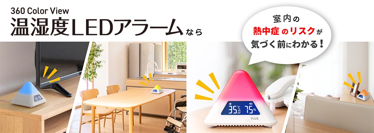そこで、プラス株式会社は、ピラミッド型本体のLEDカラーが4色に変化して危険度を分かりやすくお知らせし、室内での熱中症対策をサポートする「温湿度LEDアラーム」のプレゼントキャンペーンを2025年5月1日から5月31日まで実施いたします。