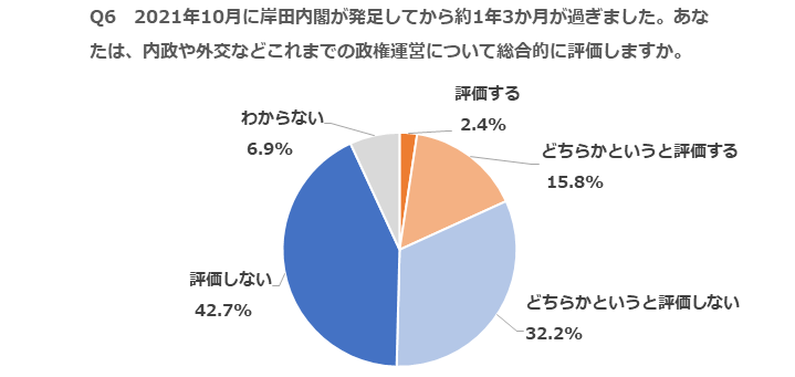 - 岸田政権これまでに行った内政、外交などの運営について、「どちらかといえば」を含め総合的に「評価する」は計18.2%にとどまり、「評価しない」は計74.9%に上った。「どちらかといえば」を含め「評価する」とした人を地域別に見ると、中国が2割強とトップで、他は2割未満だった。支持政党別で見ると、自民党4割台、公明党2割台、支持する政党はないとする無党派層は1割未満だった。(Q6)