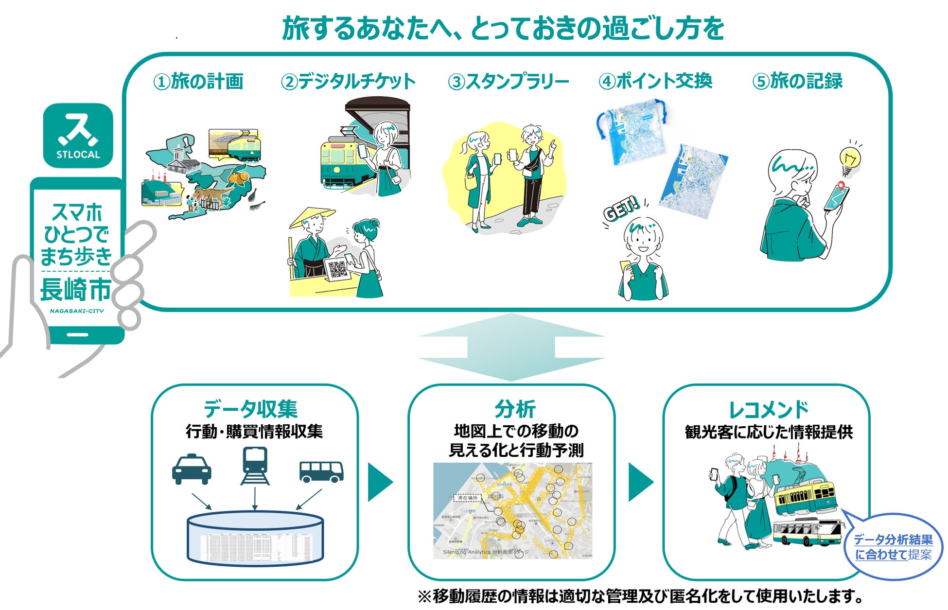 2021年12月22日から公開している観光情報Webサイトと本スマートフォンアプリとの連携により、人々の移動や位置情報の収集と分析を行い、地図上で可視化・分析することで観光客に応じた情報提供を目指します。これらの「人の行動」を喚起することにより地域活性化につなげ、地域の自治体や事業者と共に長崎市の観光の体験価値の向上に寄与することを目指します。