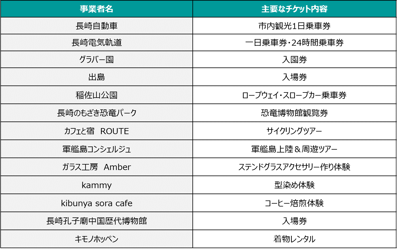 交通、市内主要観光施設、体験アクティビティなどの電子チケットを提供します。電子チケットに関しては、長崎市内のキャッシュレスな観光の実現に向け、順次追加していく予定です。