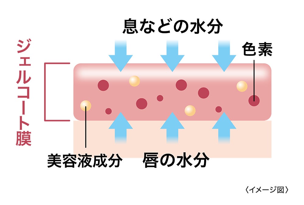 塗ってしばらくすると、唇や息の水分と反応して色素を取り込んだジェルコート膜を形成。色・ツヤ・うるおいをキープします!