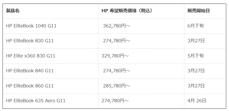・ HP EliteBook 800 G11シリーズ:強力なパフォーマンスとコラボレーション機能を必要とするナレッジワーカーに最適なシリーズです。AIを活用した生産性向上のために、インテル Core Ultra 5および7プロセッサーを搭載しています。ベゼルに使用済み再生(PCR)プラスチックが75%以上使用されています(*11)。800シリーズの新製品として13.3インチクラムシェル型「HP EliteBook 830 G11」、13.3インチ型コンバーチブル「HP Elite x360 830 G11 」、14インチ型「HP EliteBook 840 G11」、16インチ型「HP EliteBook 860 G11」を追加します。