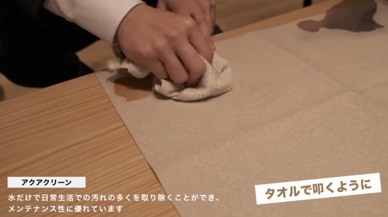 左:コーヒーで張地を汚した様子|右:水だけで汚れが取れていく様子