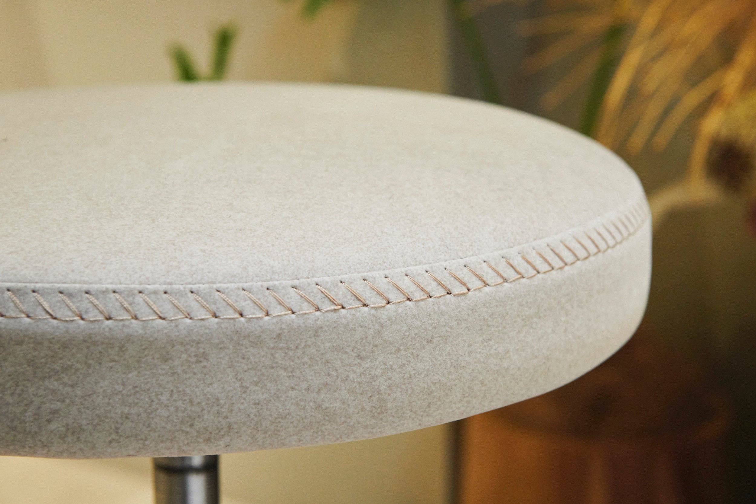 美容師用スツールは、「yiye」の為だけに製作したオリジナル仕様です。座の側面に意匠性の高いステッチを施し、美容師が長時間座っても疲れにくいよう内部のクッション材を調整し、デザイン性と機能性を兼ね備えたオリジナルスツールとなりました。