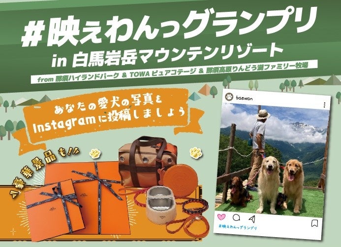 那須ハイランドパーク、TOWAピュアコテージ、那須高原りんどう湖ファミリー牧場、白馬岩岳マウンテンリゾートの敷地および施設周辺で撮影されたわんちゃんの写真を「#映えわんっグランプリ」を付けてInstagramに投稿。