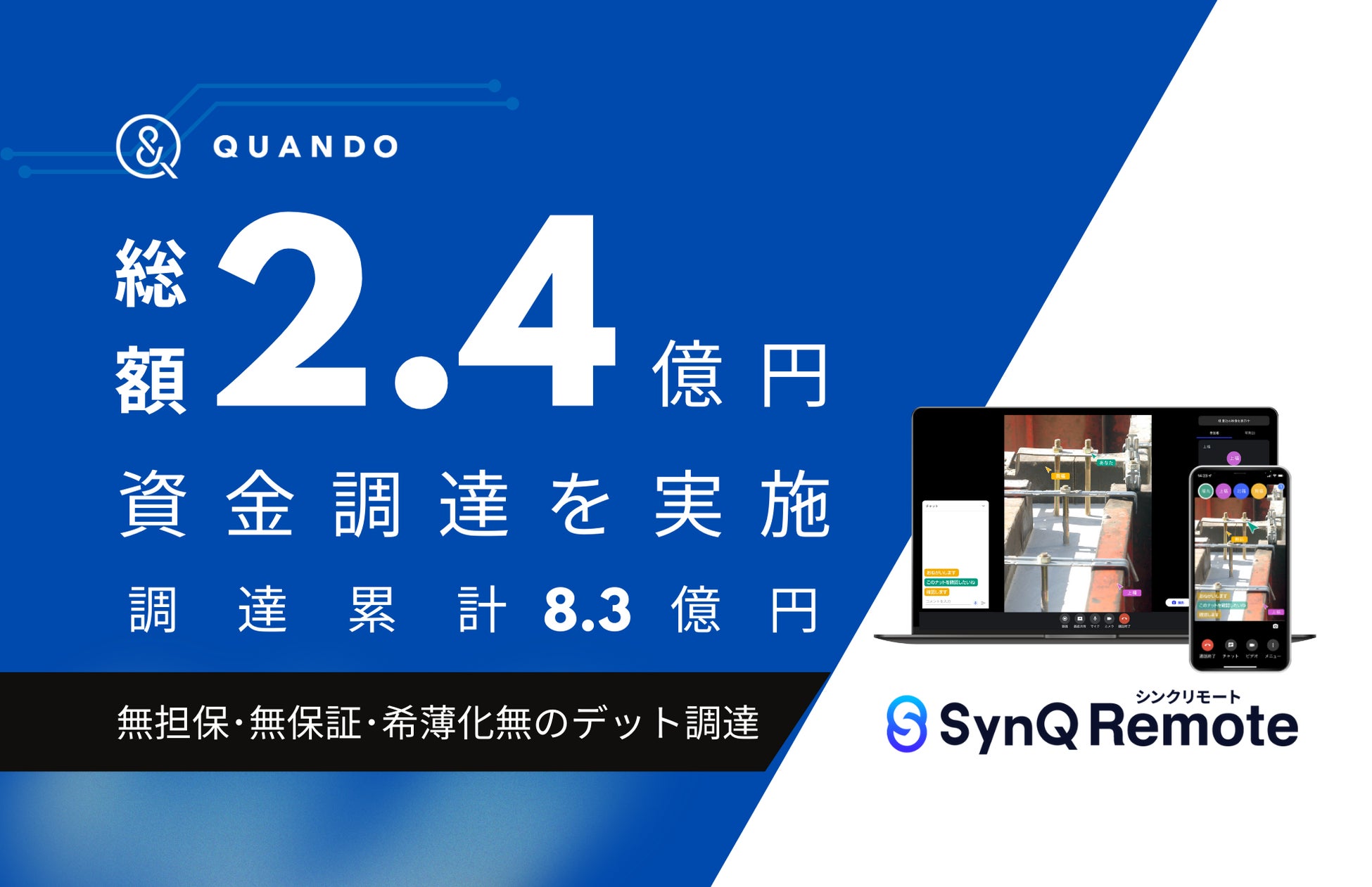 建設現場や製造現場等の現場に特化したビデオ通話ツールSynQ Remote(シンクリモート)を開発提供する株式会社クアンド(本社:福岡県北九州市、代表取締役CEO:下岡 純一郎)は、事業の成長拡大にともなう運転資金確保として、三菱UFJ銀行や日本政策金融公庫、Flex Capitalからの借入及びSiiibo証券を活用した社債発行により総額2.4億円の資金調達(融資枠を含む)を行いました。今回の借入は事業成長による財務実績や将来性を踏まえ、信用力を評価いただいたことで、いずれも無担保・無保証・希薄化無しの条件で資金調達を実現しております。なお、今回の調達により、借入を含む累計調達額は8.3億円となりました。
